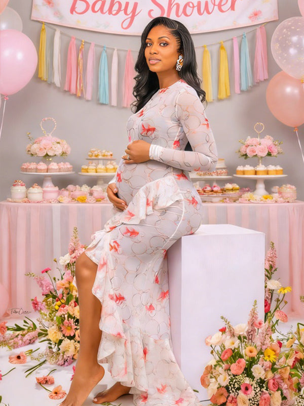 Momyknows White Print Sheer Falbala Side Slit Maternity Baby Shower Maxi Dress