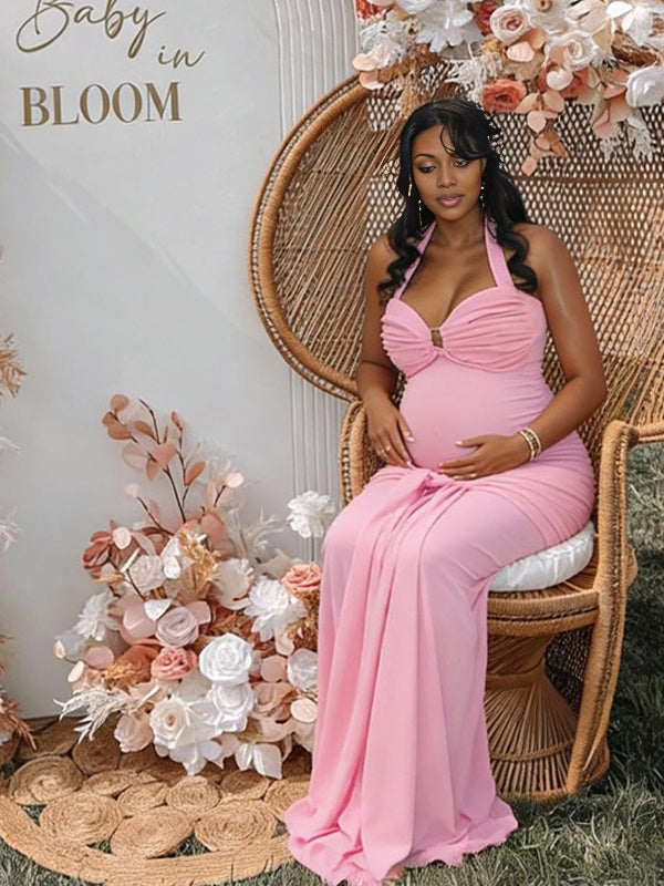 Momyknows Ruched Bowknot Draped Halter Neck Backless Bodycon Maternity Maxi Dress