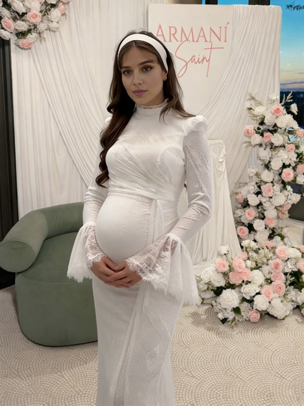 Momyknows Lace Tulle Ruffle Ruched Big Swing Wedding Gown Maternity Maxi Dress