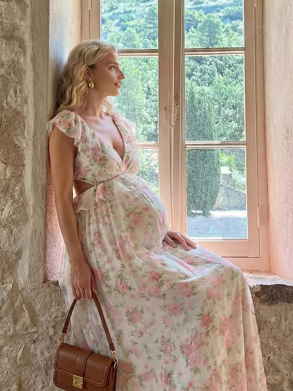 Momyknows Floral Ruffle Falbala Big Swing Backless Flowy Maternity Maxi Dress