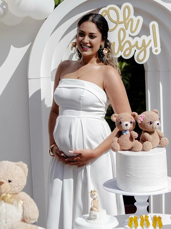 Momyknows White Ruched Bandeau Strapless A-line Elegant Maternity Maxi Dress