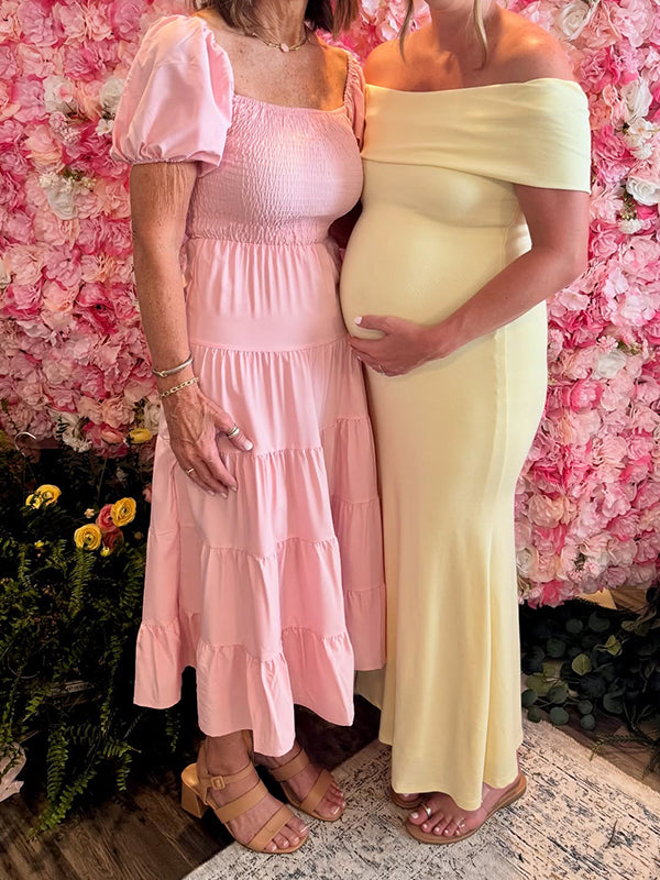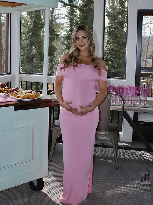Momyknows Pink Off Shoulder Ruched Bodycon Elegant Maternity Maxi Dress