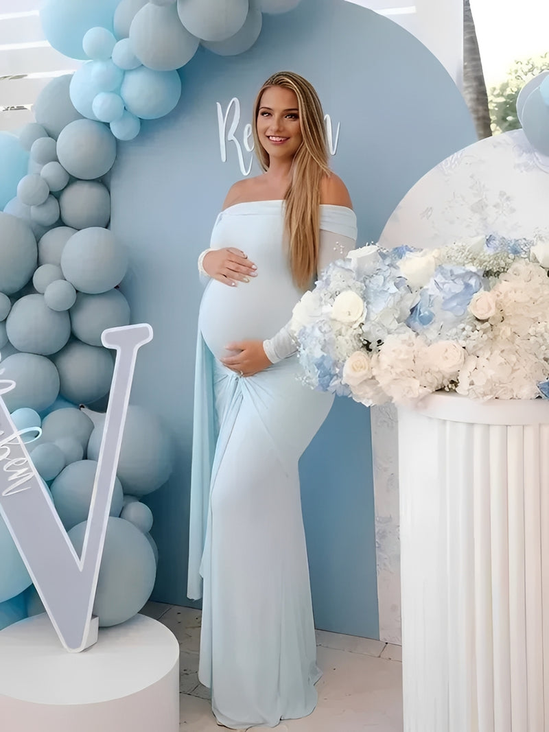 Momyknows Blue Mesh Off Shoulder Ruched Bowknot Draped Maternity Maxi Dress