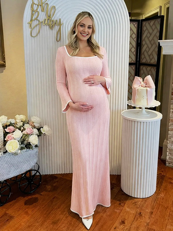 Momyknows Knit Ruffle Falbala Hollow Out Bodycon Maternity Maxi Sweater Dress
