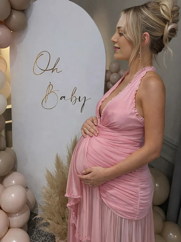 Momyknows Pink Mesh Ruffle Ruched Draped Backless Maternity Maxi Dress