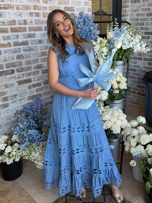 Momyknows Blue Lace Ruffle Hollow Out Belt A-line Elegant Maternity Maxi Dress