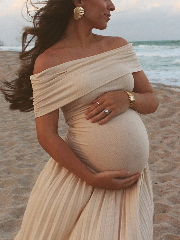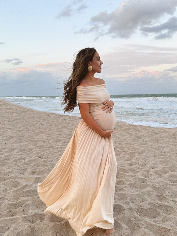 Momyknows Apricot Off Shoulder Ruched Pleated Big Swing Maternity Baby Shower Maxi Dress