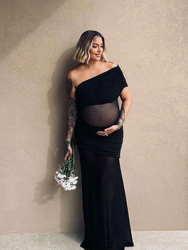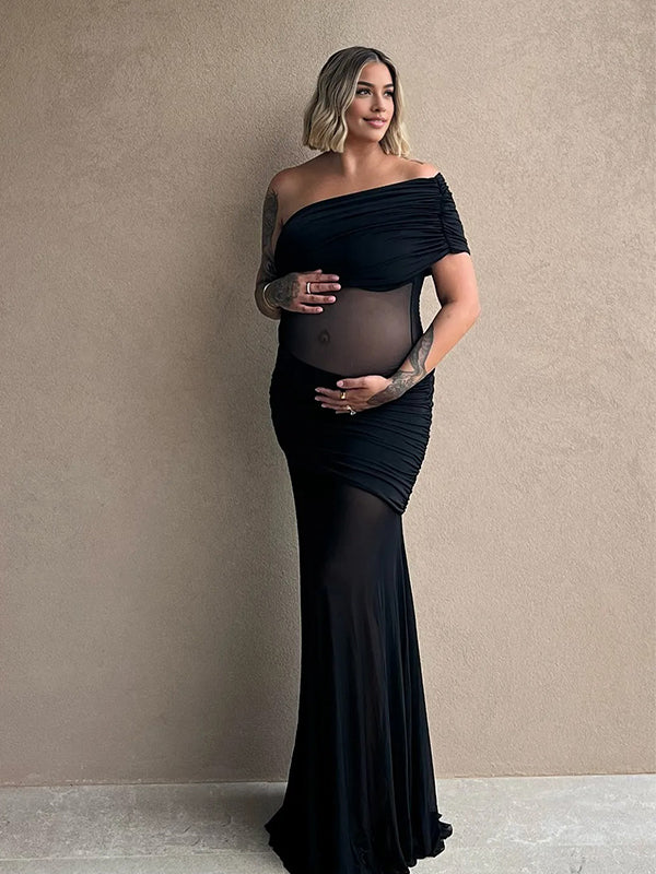 Momyknows Black Mesh Ruched One Shoulder Big Swing Sheer Maternity Maxi Dress