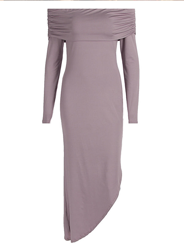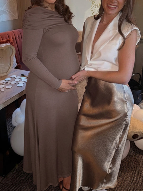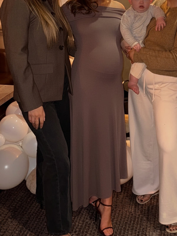 Momyknows Brown Off Shoulder Ruched Irregular Hem Maternity Maxi Dress