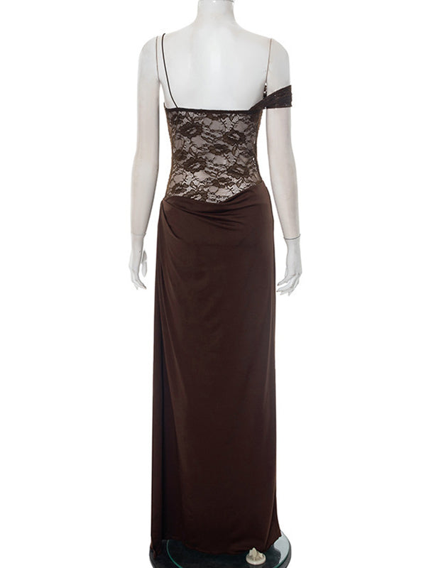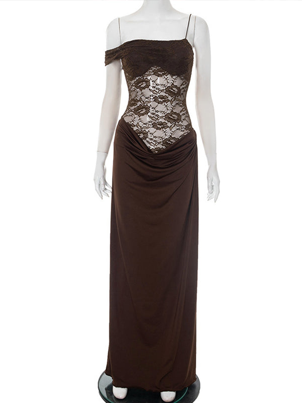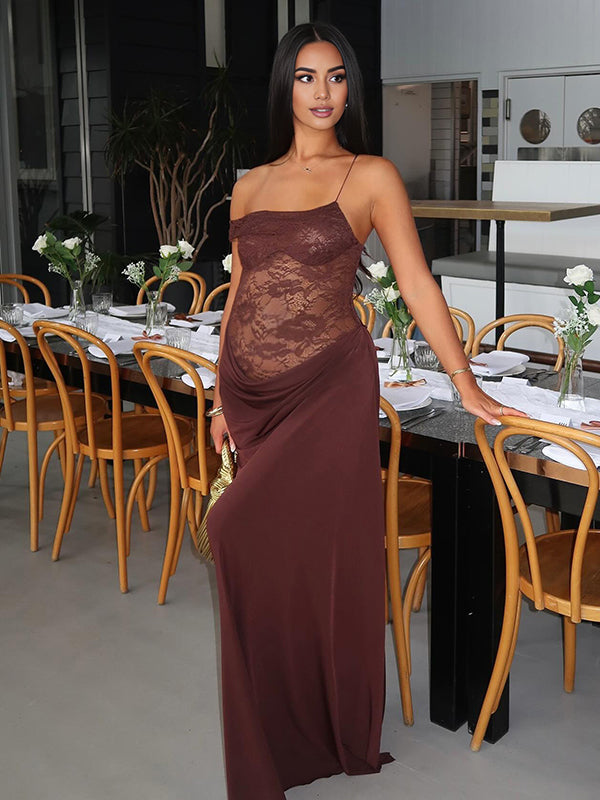 Momyknows Lace Patchwork One Shoulder Ruched Cami Bodycon Maternity Maxi Dress