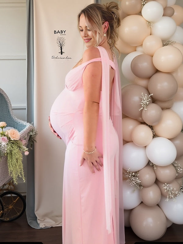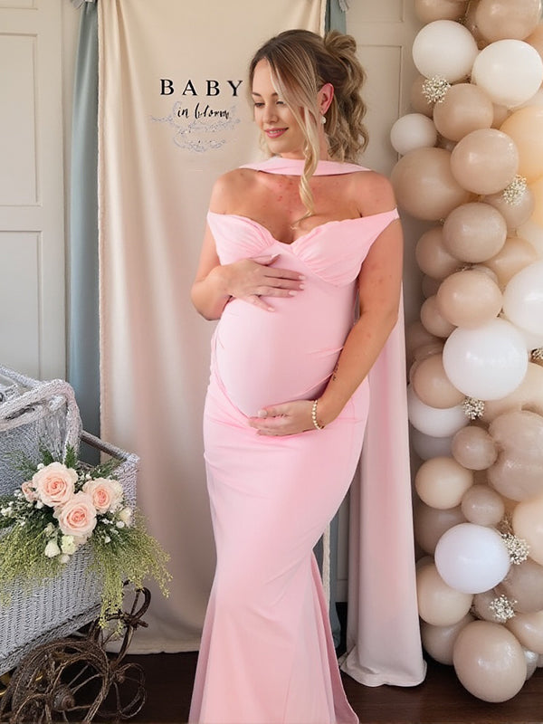 Momyknows Mesh Off Shoulder Ruched Draped Scarf Backless Maternity Maxi Dress