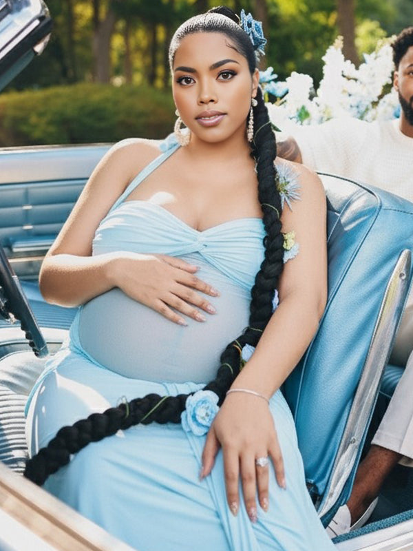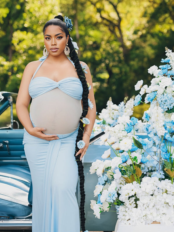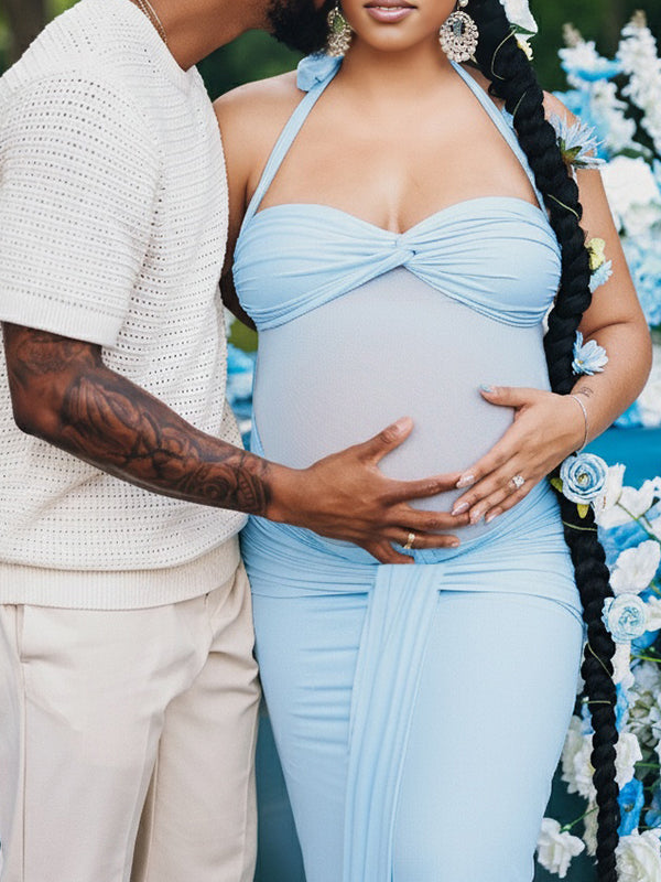 Momyknows Ruched Mesh Draped Halter Neck Backless Maternity Maxi Dress