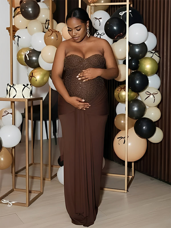 Momyknows Brown 2-in-1 Solid Color Elegant Bodycon Baby Shower Maternity Maxi Dress