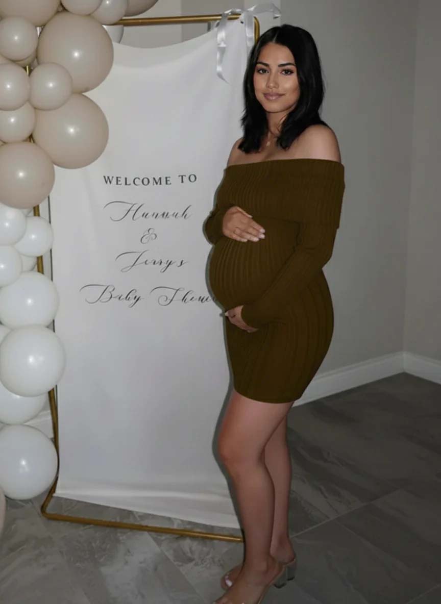 Momyknows Brown Off Shoulder Long Sleeve Bodycon Elegant Going Out Maternity Photoshoot Baby Shower Party Maxi Dress