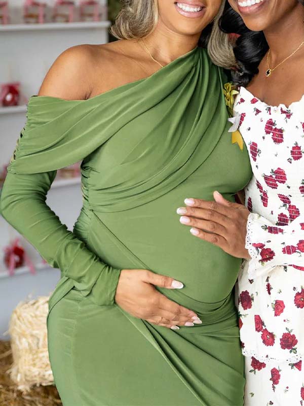 Momyknows Green One Shoulder Ruched Baby Shower Maternity Maxi Dress