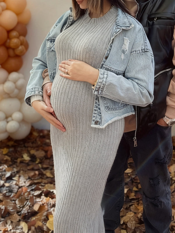 Momyknows Grey Striped Crochet Maternity Baby Shower Sweater Maxi Dress