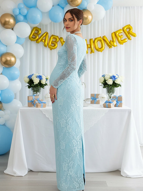 Momyknows Lace Ruffle Back Slit Square Neck Bodycon Maternity Maxi Dress
