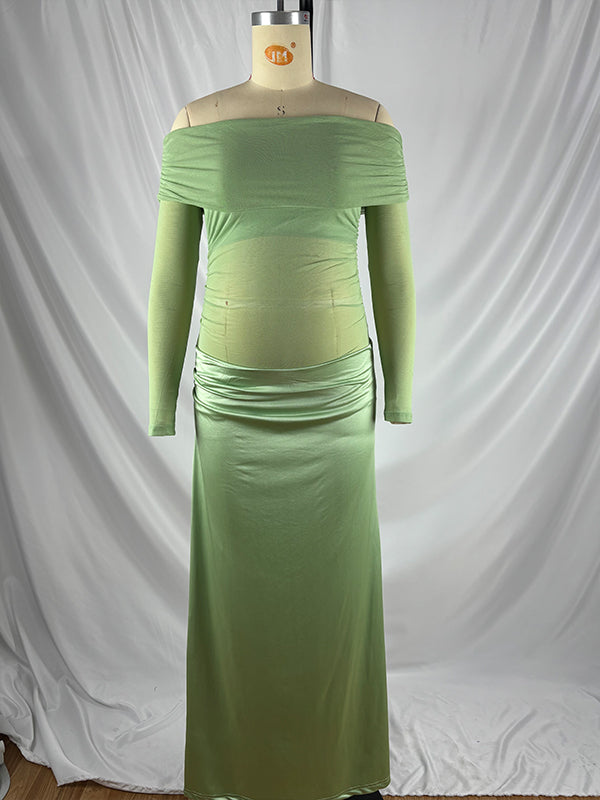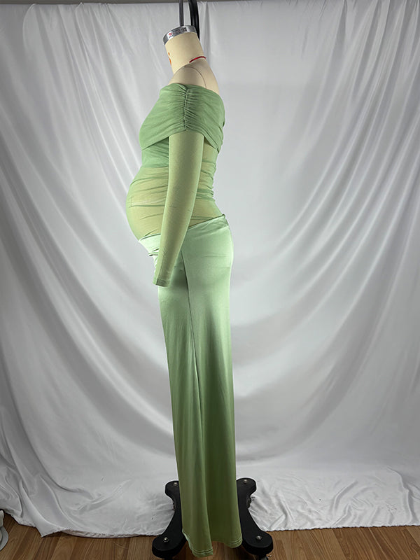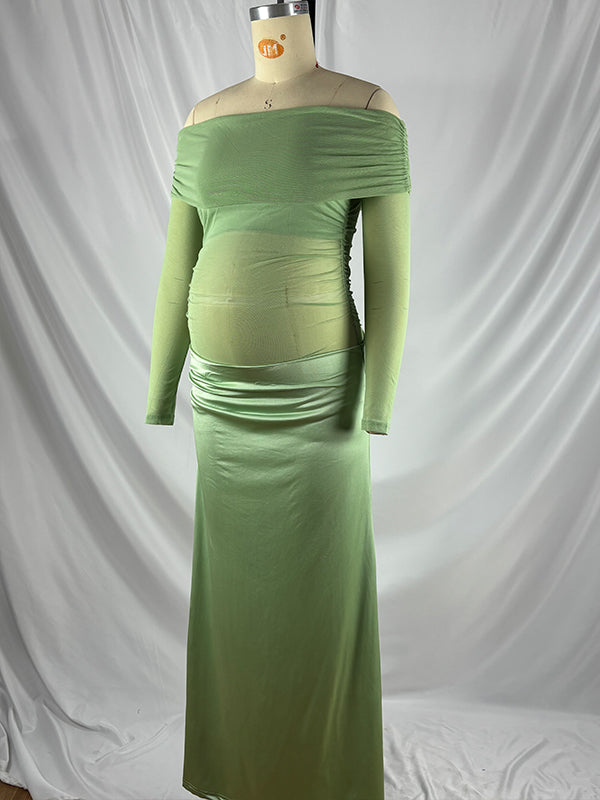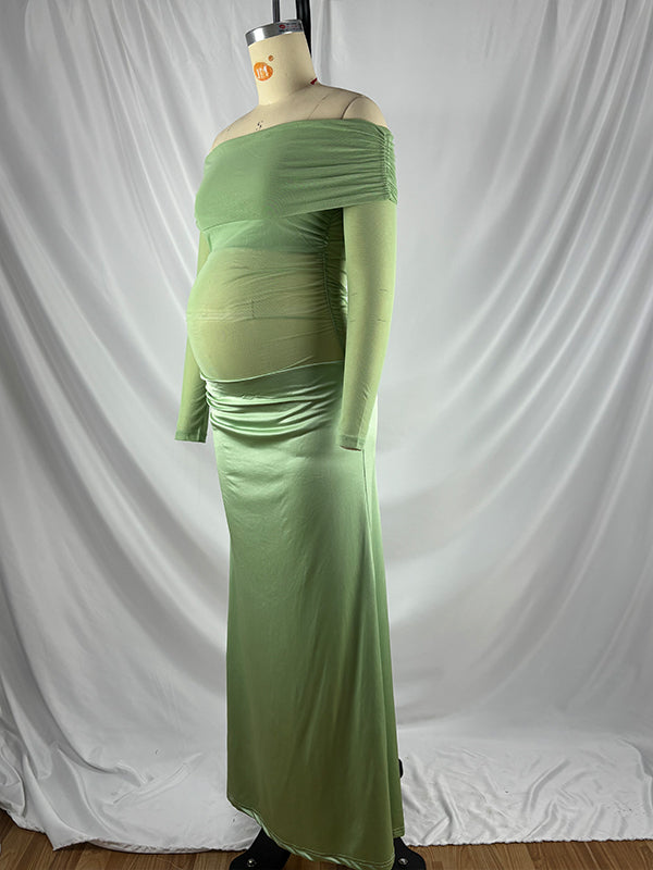 Momyknows Mesh Patchwork Ruched Off Shoulder Cut Out Elegant Cocktail Party Gown Sheer Maternity Photoshoot Baby Shower Maxi Dress