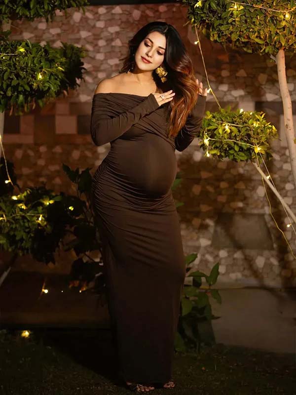 Momyknows Off Shoulder Cross Chest Ruched Bodycon Elegant Maternity Maxi Dress