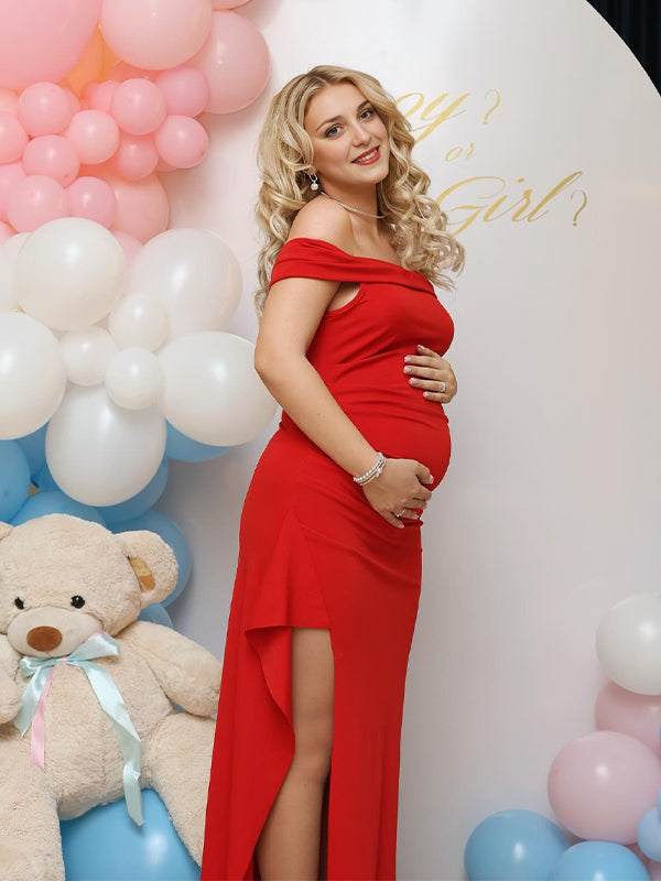 Momyknows Red Off Shoulder Side Slit Ruffle Baby Shower Maternity Maxi Dress