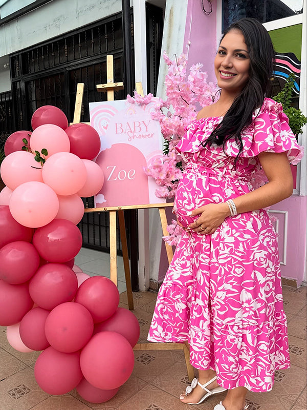 Momyknows Rose Carmine Off Shoulder Falbala Print Maternity Baby Shower Maxi Dress