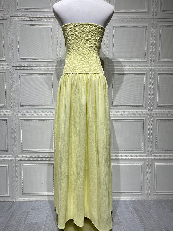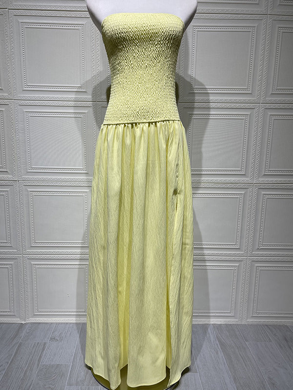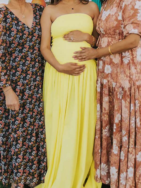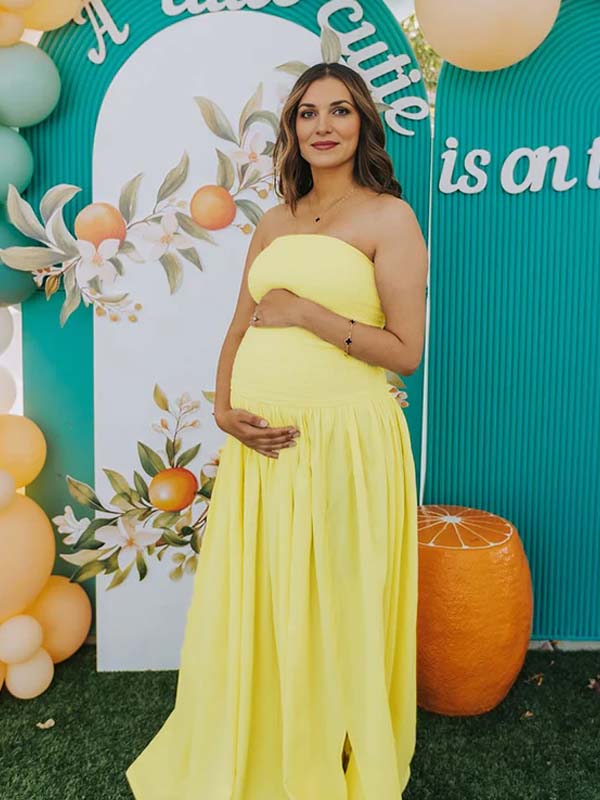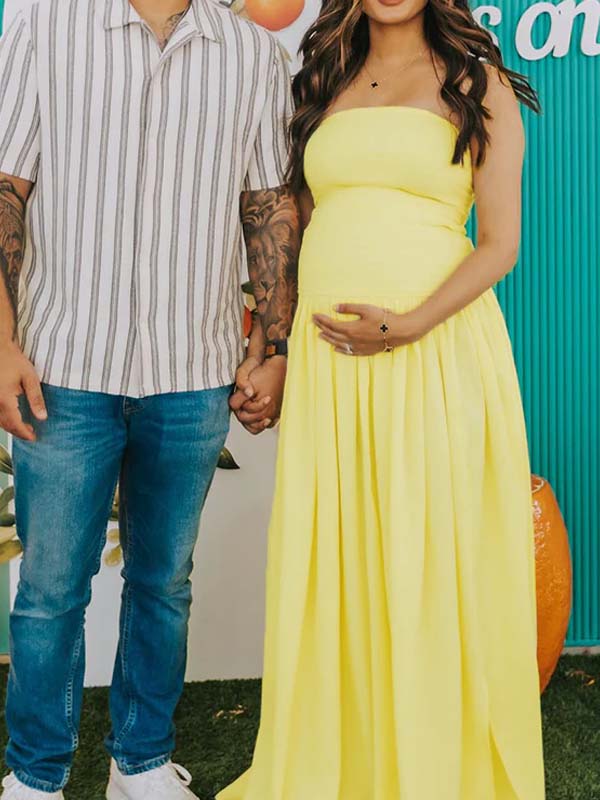 Momyknows Yellow Smocked Big Swing Side Slit Strapless Elegant Maternity Maxi Dress
