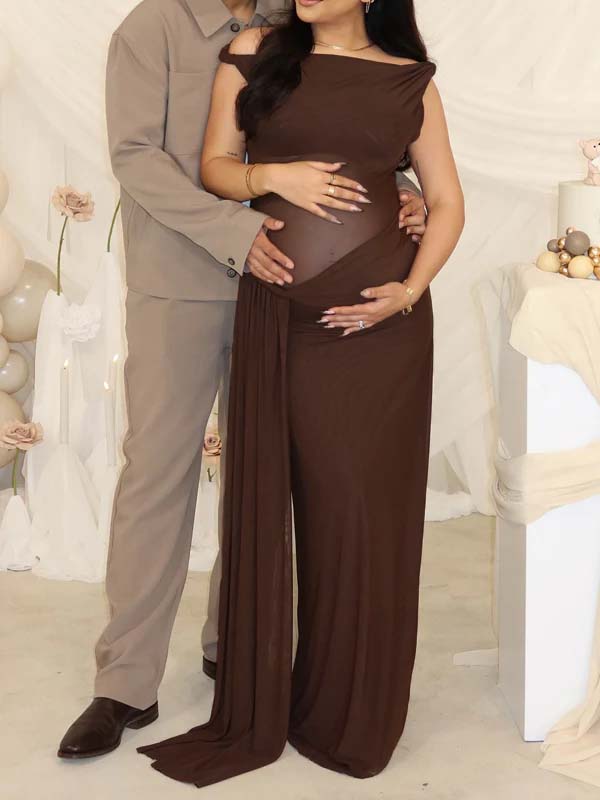 Momyknows Dark Brown Oblique Shoulder Sheer Draped Hem Ruched Maternity Baby Shower Maxi Dress