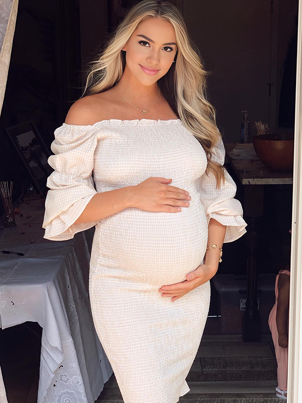 Momyknows Ruffle Off Shoulder Long Sleeve Bodycon Baby Shower Maternity Midi Dress