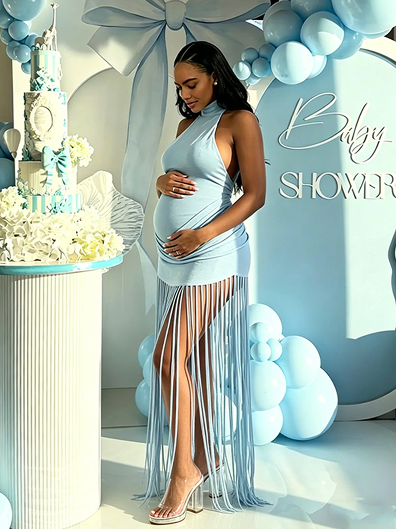 Momyknows Backless Halter Neck Tassel Ruffle Hip Bodycon Clubwear Baby Shower Maternity Maxi Dress