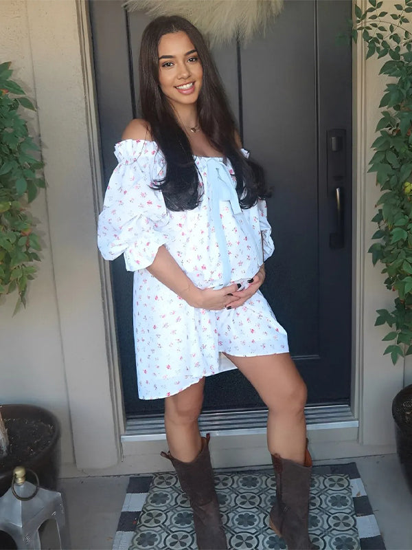 Momyknows White Floral Bow Puff Sleeve Cute Baby Shower Maternity Mini Dress