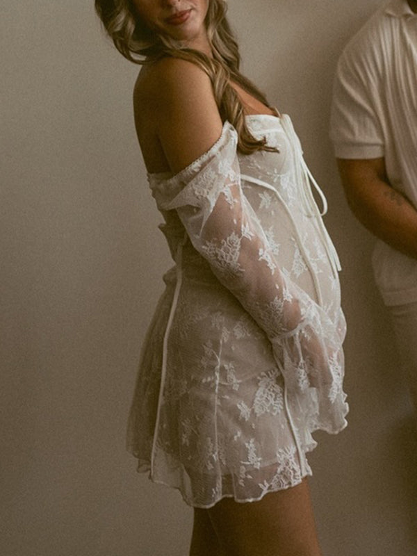 Momyknows White Lace Off Shoulder Bow Drawstring Ruffle Flare Sleeve Elegant Baby Shower Maternity Mini Dress
