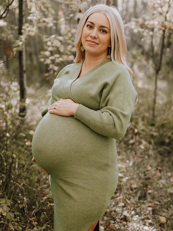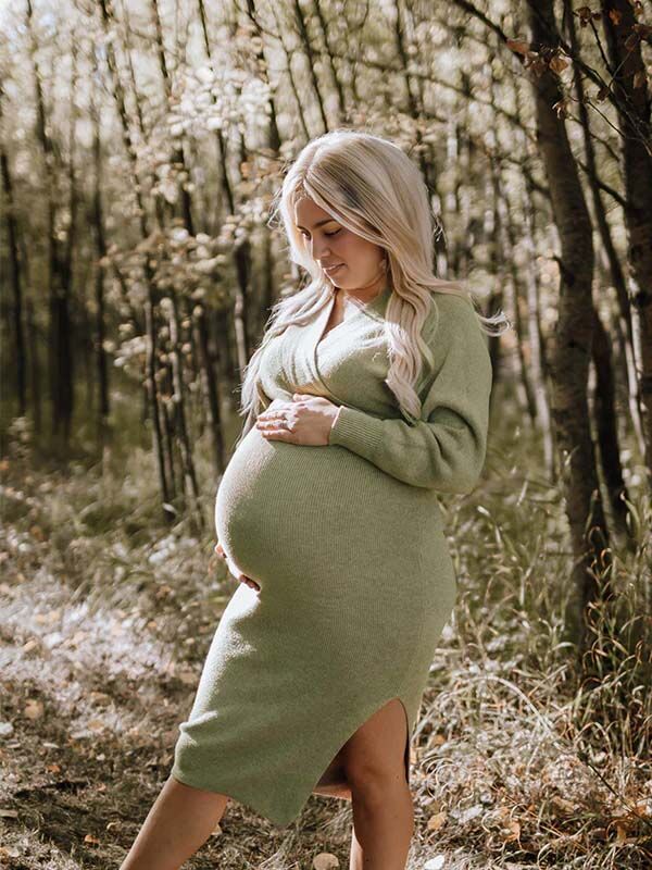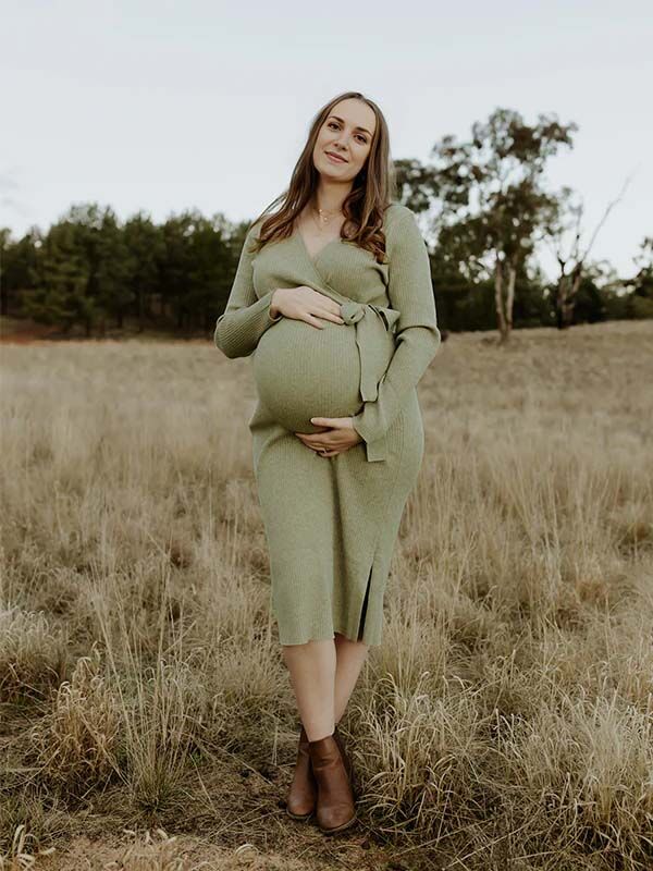 Momyknows Knit Solid Color Sashes V-Neck Double Split Backless Bodycon Photoshoot Maternity Sweater Midi Dress