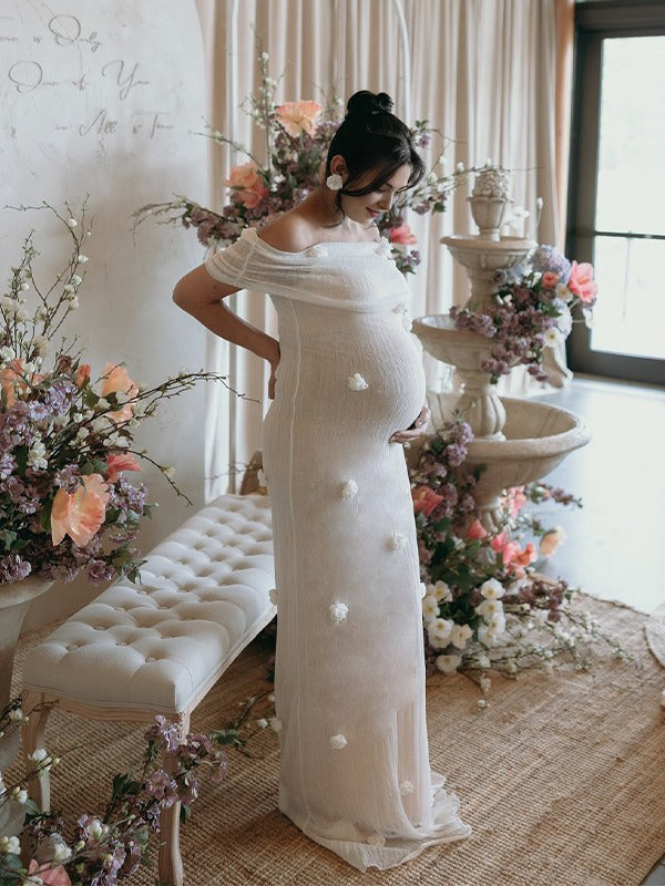 Momyknows White Off Shoulder 3D Flowers Grenadine Sheer Bodycon Elegant Beach Photoshoot Baby Shower Maternity Maxi Dress