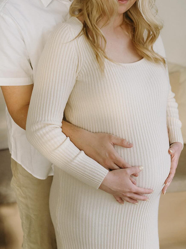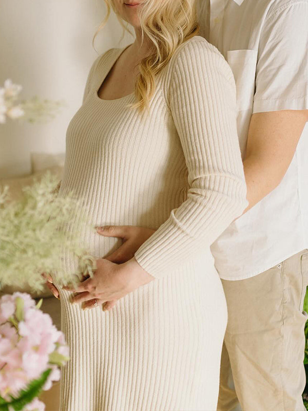 Momyknows Apricot Knit Square Neck Side Slit Maternity Sweater Midi Dress