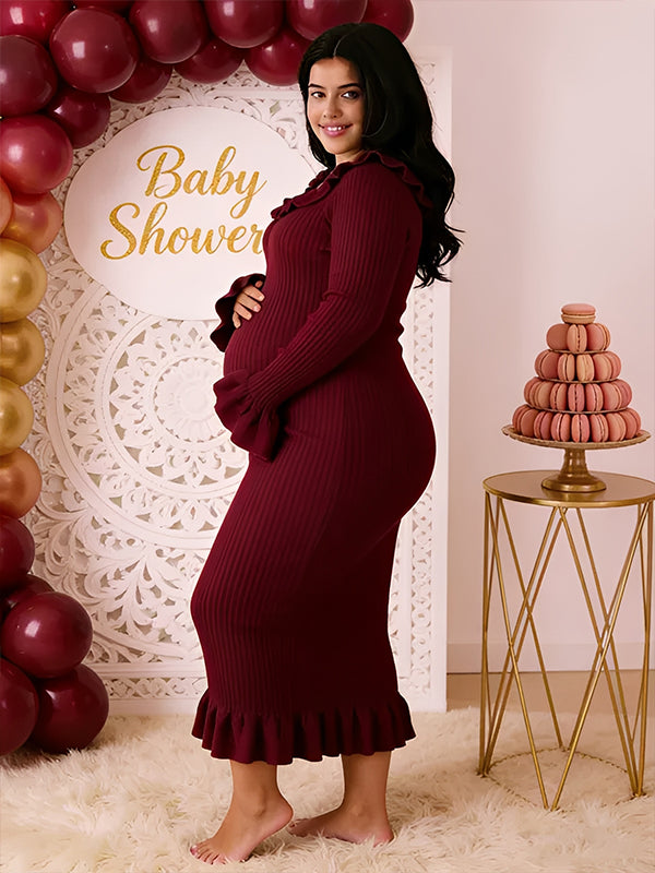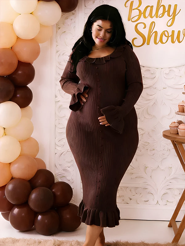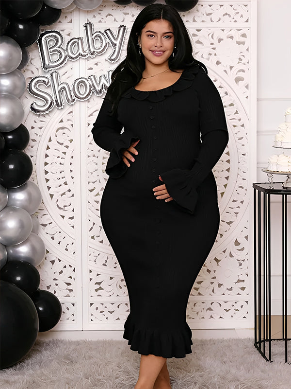 Momyknows Flare Sleeve Lace Trim Button Trumpet Maternity Sweater Baby Shower Maxi Dress