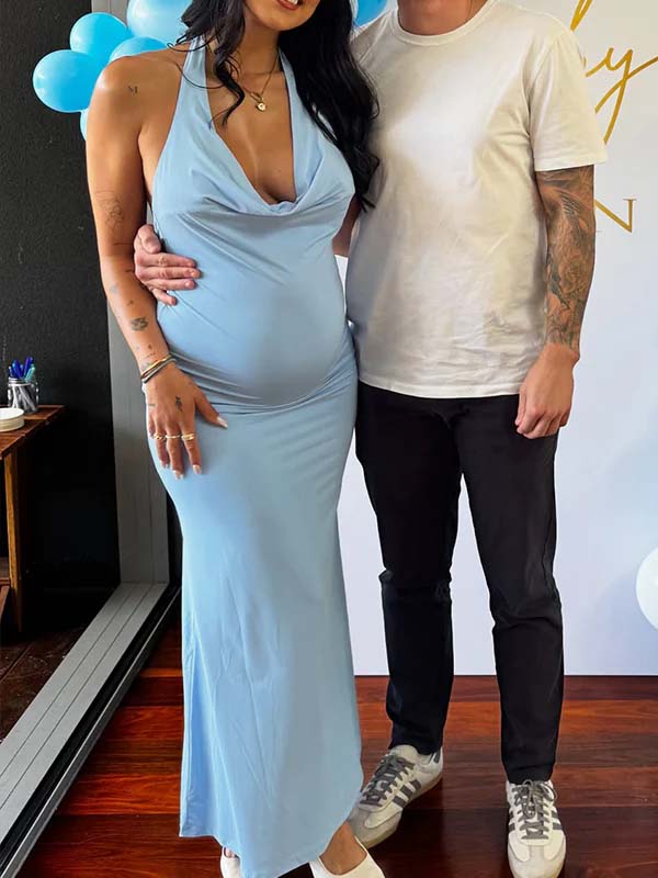 Momyknows Blue Ruched Cowl Neck Backless Mermaid Maternity Maxi Dress