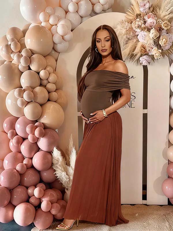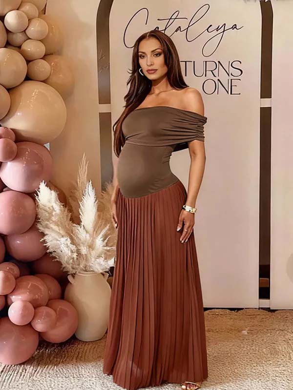 Momyknows Brown Off Shoulder Ruched Open Back Splicing Maternity Baby Shower Maxi Dress