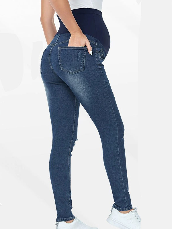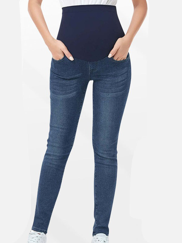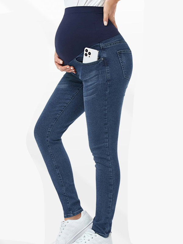 Momyknows Dark Blue Pockets Abdominal Support Maternity Skinny Pencil Jeans