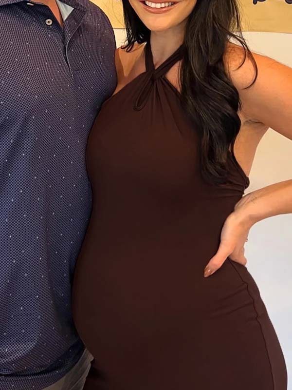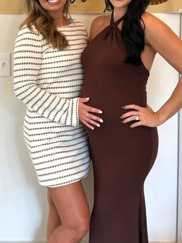 Momyknows Dark Brown Halter Neck Ruched Open Back Maternity Baby Shower Maxi Dress