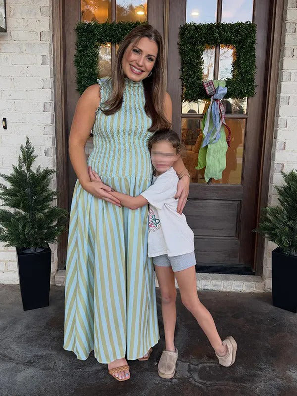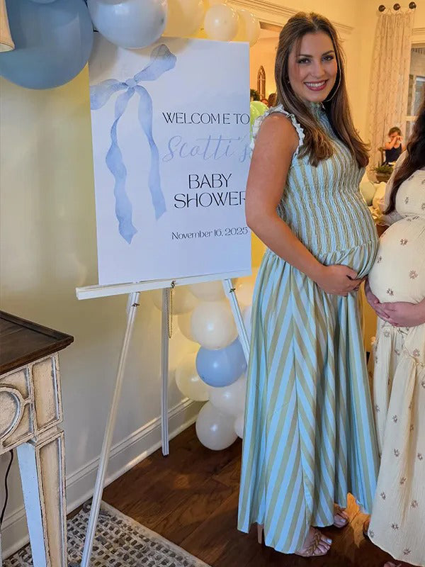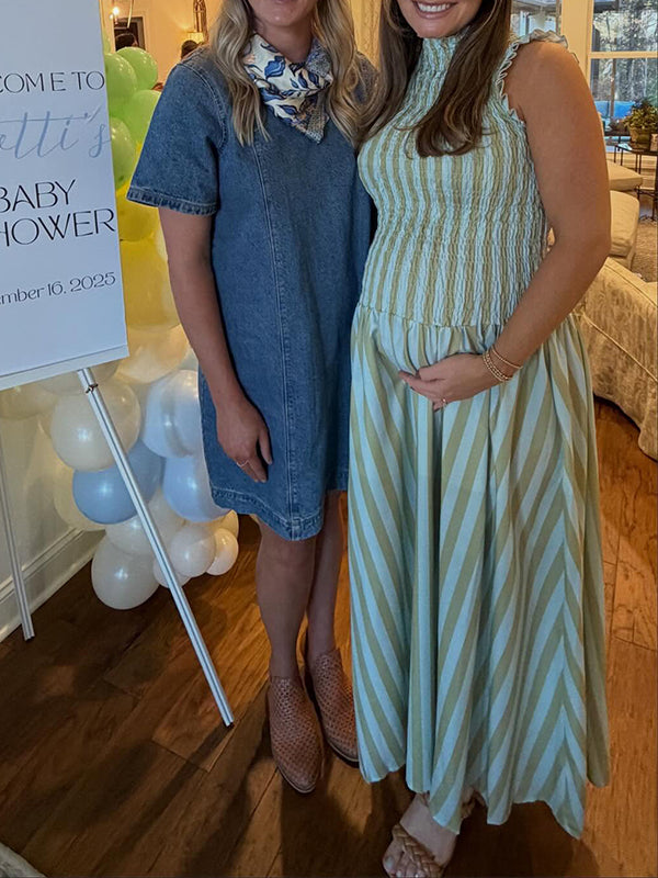 Momyknows Green Smocked Striped Ruffle Baby Shower Maternity Maxi Dress