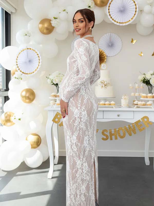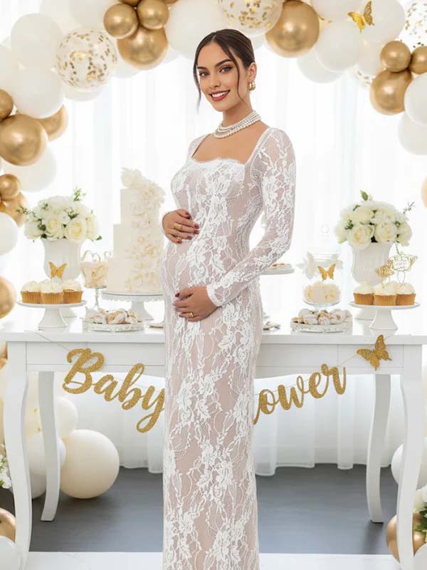 Momyknows Lace Ruffle Back Slit Square Neck Bodycon Maternity Maxi Dress