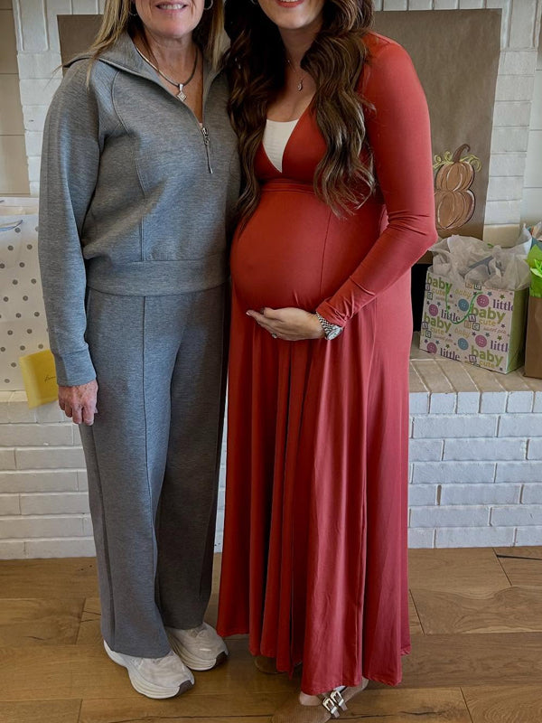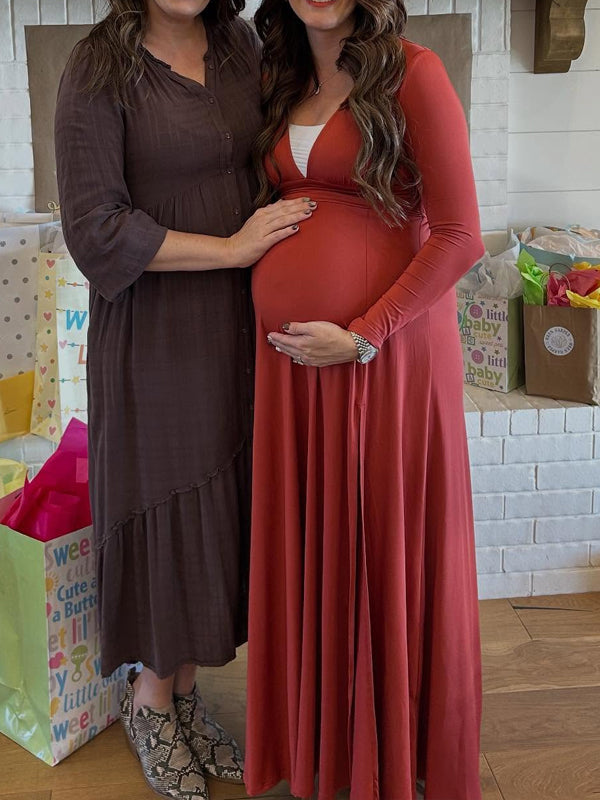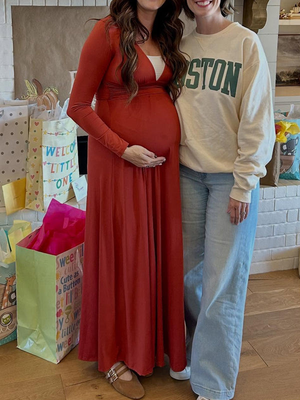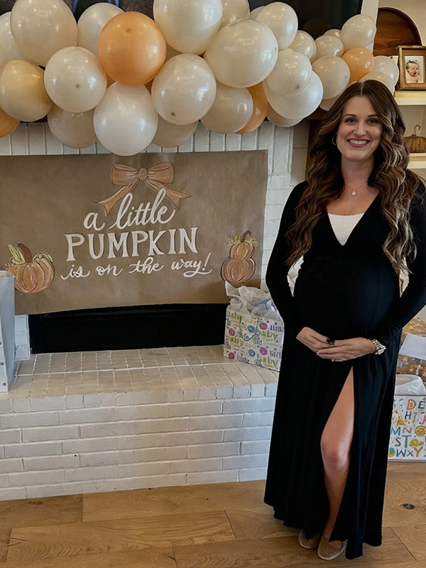 Momyknows Smocked Deep V Ruched Side Slit Maternity Baby Shower Maxi Dress