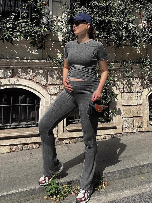 Momyknows Solid Color Two Piece Lounge Set Short Sleeve Crop Top And Foldover Flare Pants Casual Maternity Yoga Going Out Outfit