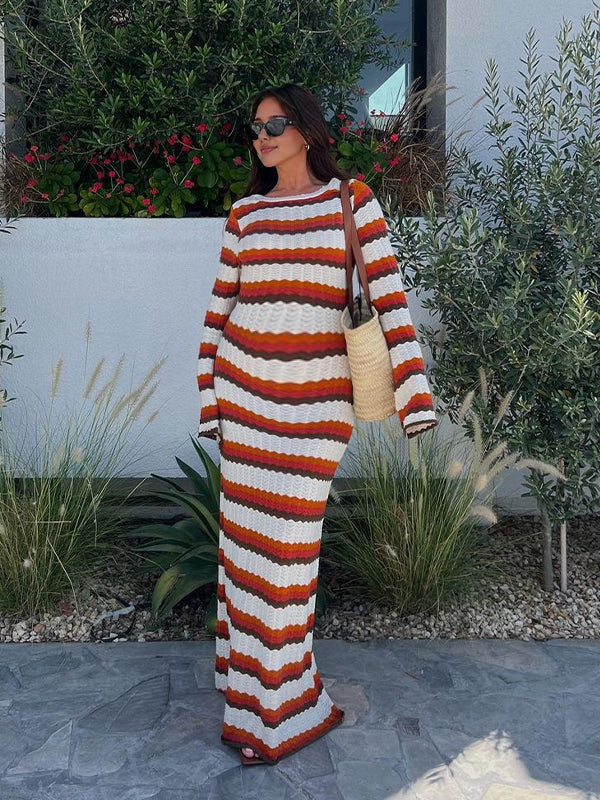 Momyknows Orange Knit Striped Backless Baby Shower Maternity Maxi Dress