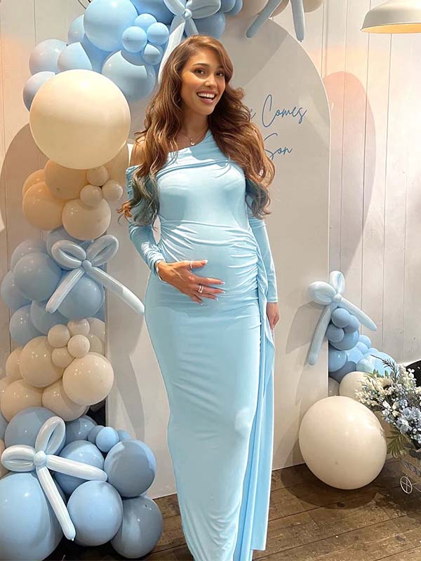 Momyknows Blue One Shoulder Ruched Draped Baby Boy Shower Maternity Maxi Dress