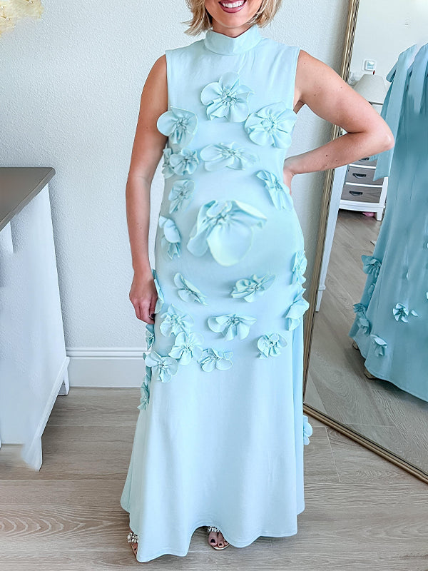 Momyknows 3D Flowers Band Neck Back Bow Photoshoot Baby Shower Maternity Maxi Dress