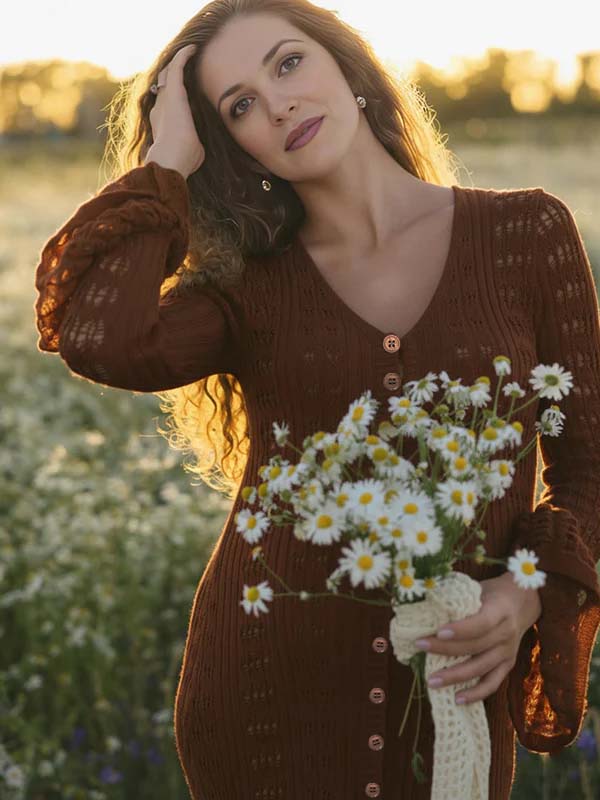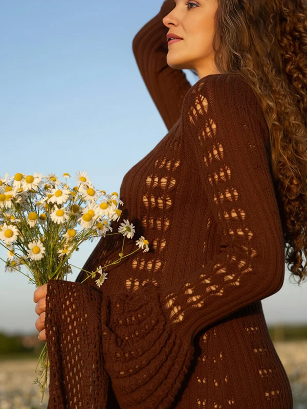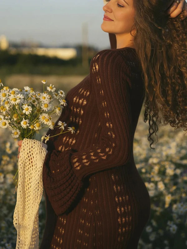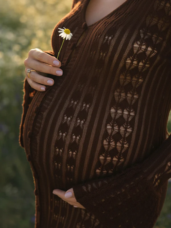 Momyknows Coffee Ruffle Crochet Hollow Out Single Breasted Slit Maternity Maxi Dress