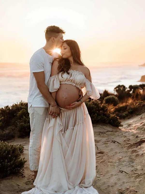 Momyknows Solid Color Bohemian Off Shoulder Backless Ruffle 2 piece set Photoshoot Maternity Maxi Dress