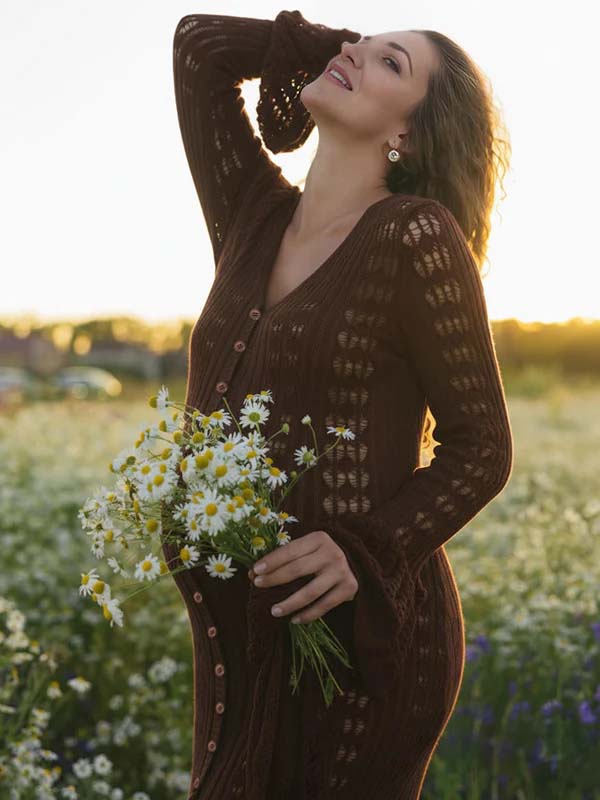 Momyknows Coffee Ruffle Crochet Hollow Out Single Breasted Slit Maternity Maxi Dress