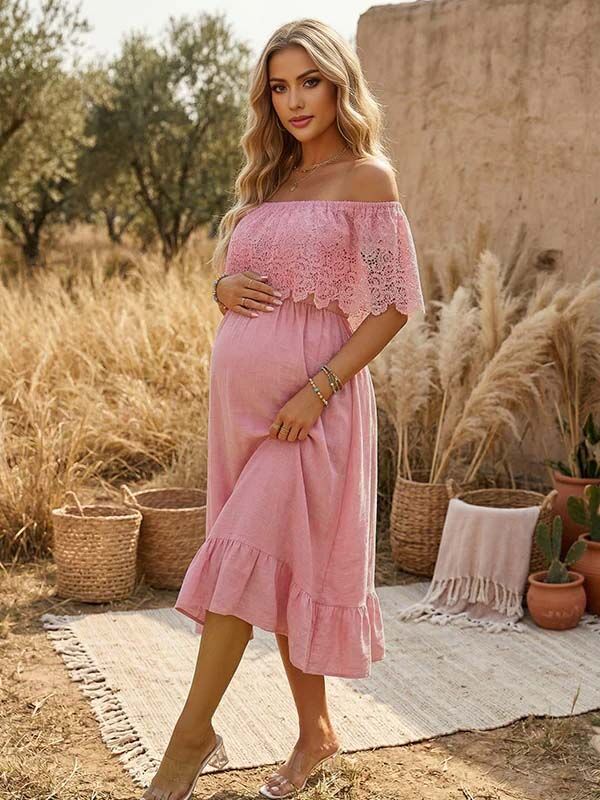 Momyknows Pink Lace Ruffle Off Shoulder A-line Boho Maternity Maxi Dress